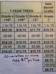1. Bench Grafts & 1 year trees: most preferred, lowest cost to produce and ship, with newly made ‘whip & tongue’ grafts, sold bareroot and shipped March to May, (June for colder regions), $15.75 for one to 19 trees. These are somewhat fragile but we have excellent response. You may want sturdier ‘1-Year Trees’ where I grow these on for the season adding about $5 and ship October-May. Shipping/handling these trees is $15 plus 20% of total.