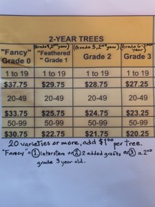 3. 3 year old trees: usually 3 to 4 feet and 3 or year old, $34-$50 priced by quality and quantity. I will send photos. Shipping is $25 + 20% of order. In 2024 I have about 1500 3 year old trees (grafted Spring 2021).